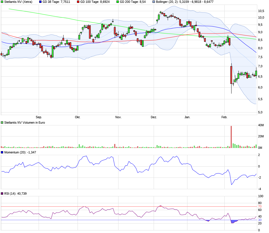 Am 11. Februar wurde im RuMaS Express-Service die Überschrift gewählt: „Blitzabsturz nach Milliardenabschreibungen – Chance oder Risiko für Trader?“ Der Artikel ging detailliert auf die Gründe für die starken Kursverluste ein. In der Stellungnahme an die Abonnenten wurde festgehalten, dass der drastische Kurssturz verdeutlicht, wie sensibel der Markt momentan auf negative Nachrichten und Unsicherheit reagiert. Es wurde betont, dass zum damaligen Zeitpunkt nicht absehbar war, ob der Einbruch bereits das Ende der Krise markiert oder ob weitere Turbulenzen bevorstehen. Für risikobereite Anleger wurde ein Einstieg ab 6,60 Euro empfohlen. Heute konnte die Aktie des Autokonzerns Stellantis, der Marken wie Peugeot, Citroen, Opel, Fiat, Alfa Romeo und Lancia vereint und damit eine der größten Markensammlungen der Autoindustrie aufweist, zeitweise einen Zuwachs von fast 7 Prozent verzeichnen. Dieser Anstieg könnte unter anderem darauf zurückzuführen sein, dass das US-Analysehaus Bernstein Research sein Kursziel von 8,50 Euro bestätigt hat.
